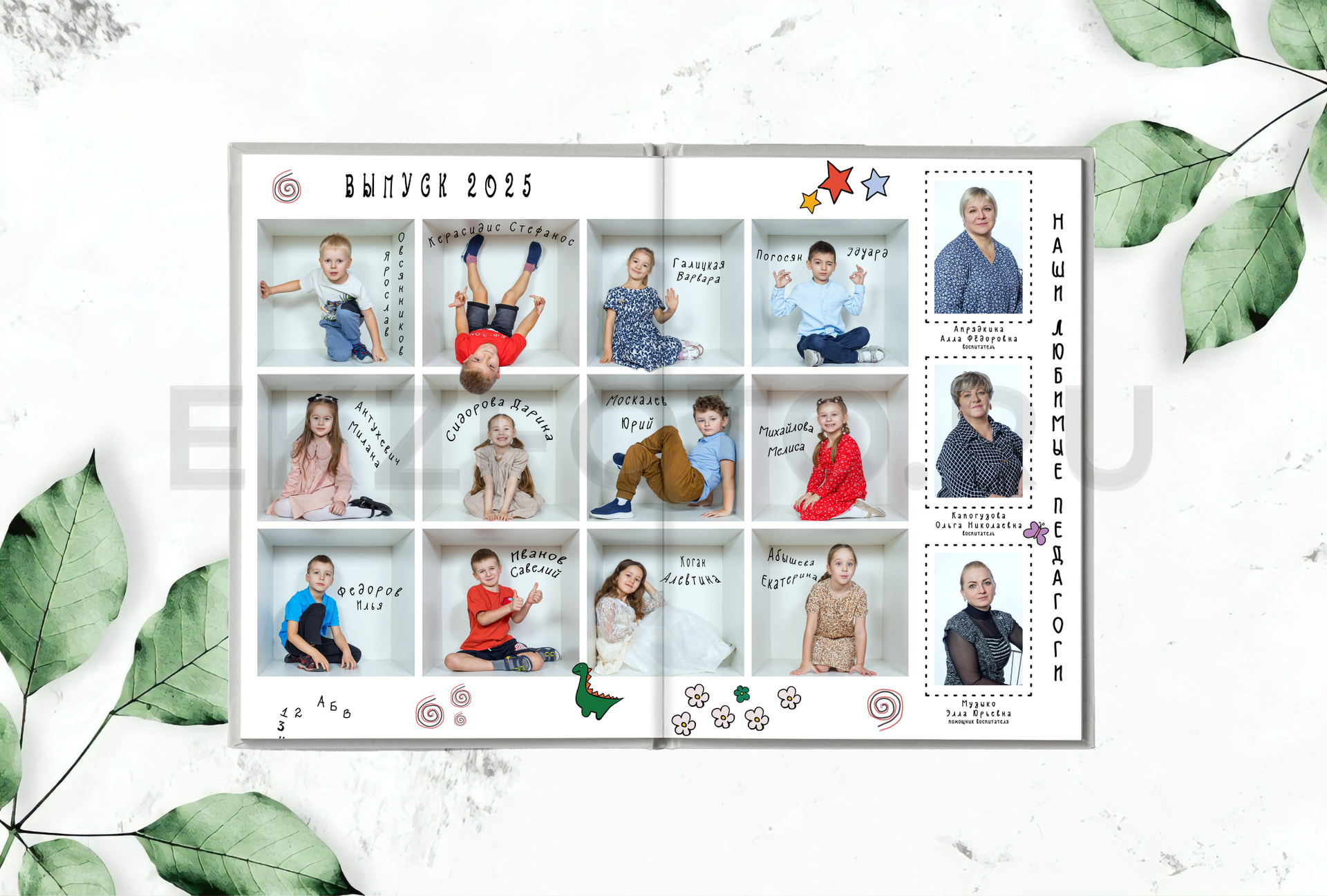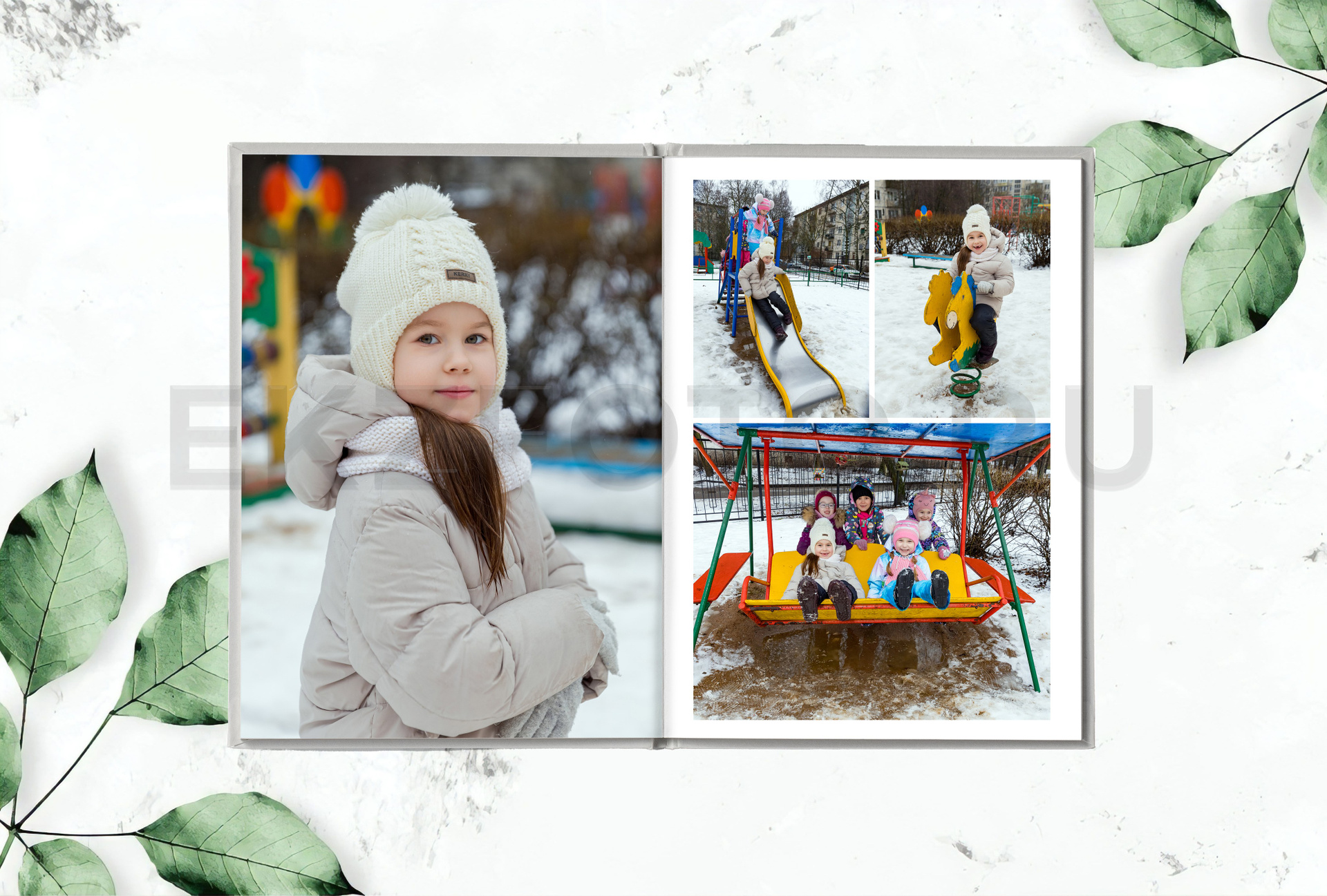 2 день. Фотосъёмка в течении 6 часов: игра, занятие, прогулка, режимные моменты. Изготовление выпускной фотокниги с индивидуальным наполнением для каждого ребенка. Формат фотокниги 21×30 см, 10 разворотов, твердая фотообложка, плотные ламинированные страницы, открывающиеся на 180 градусов.