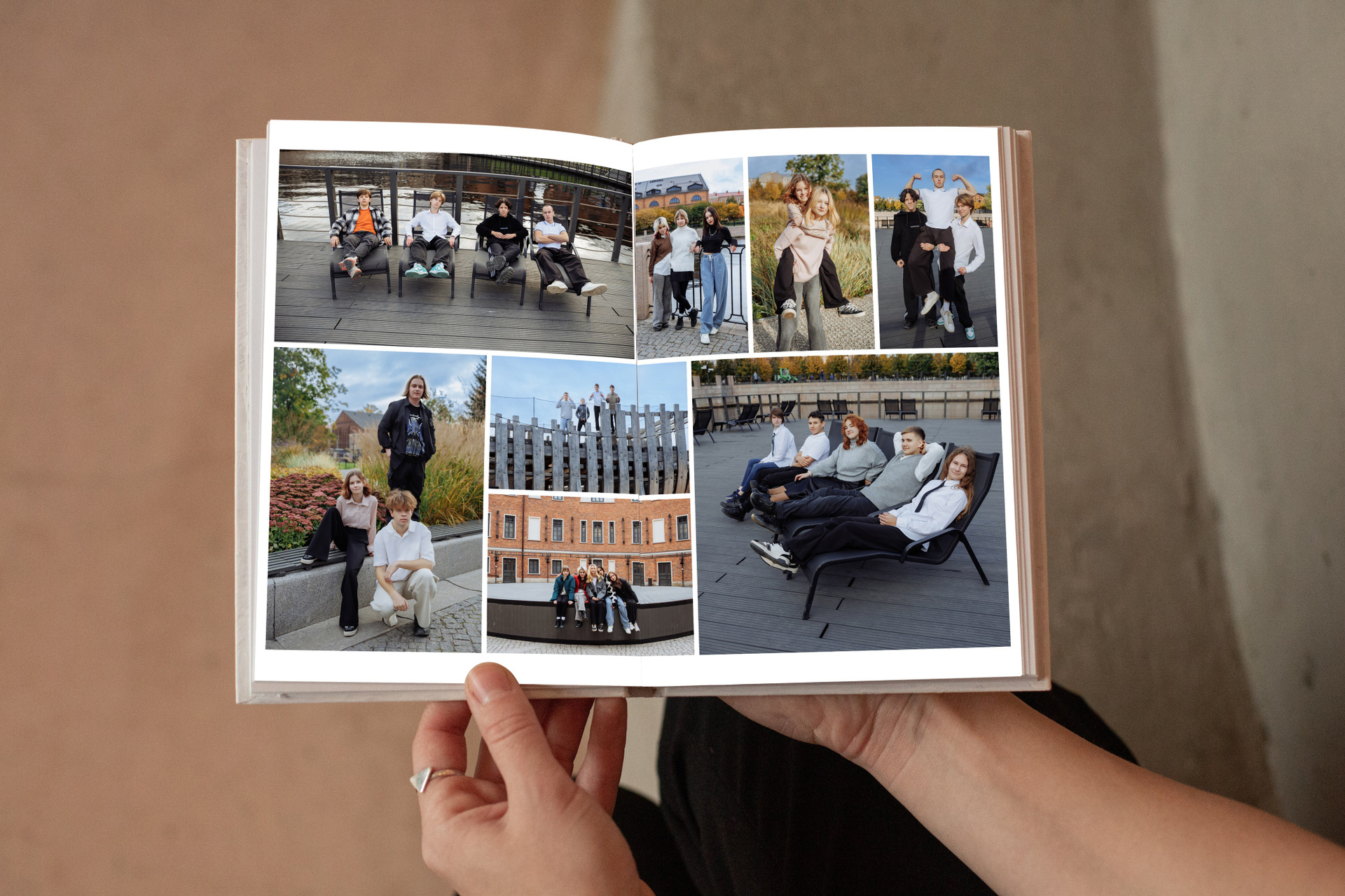 Изготовление выпускной фотокниги форматом 21×30 см, с твердой книжной полиграфической обложкой и ламинацией внутренних страниц. Максимальное количество разворотов — 7 или 14 страниц.